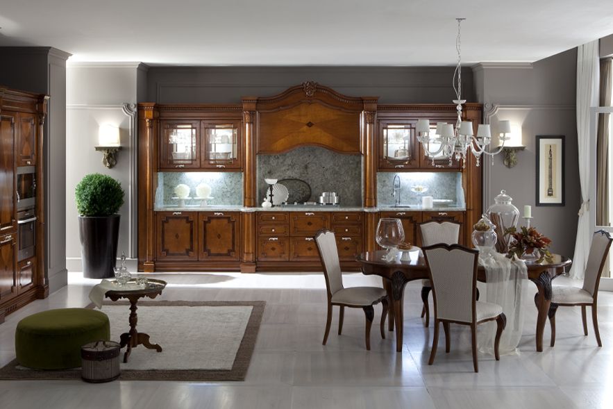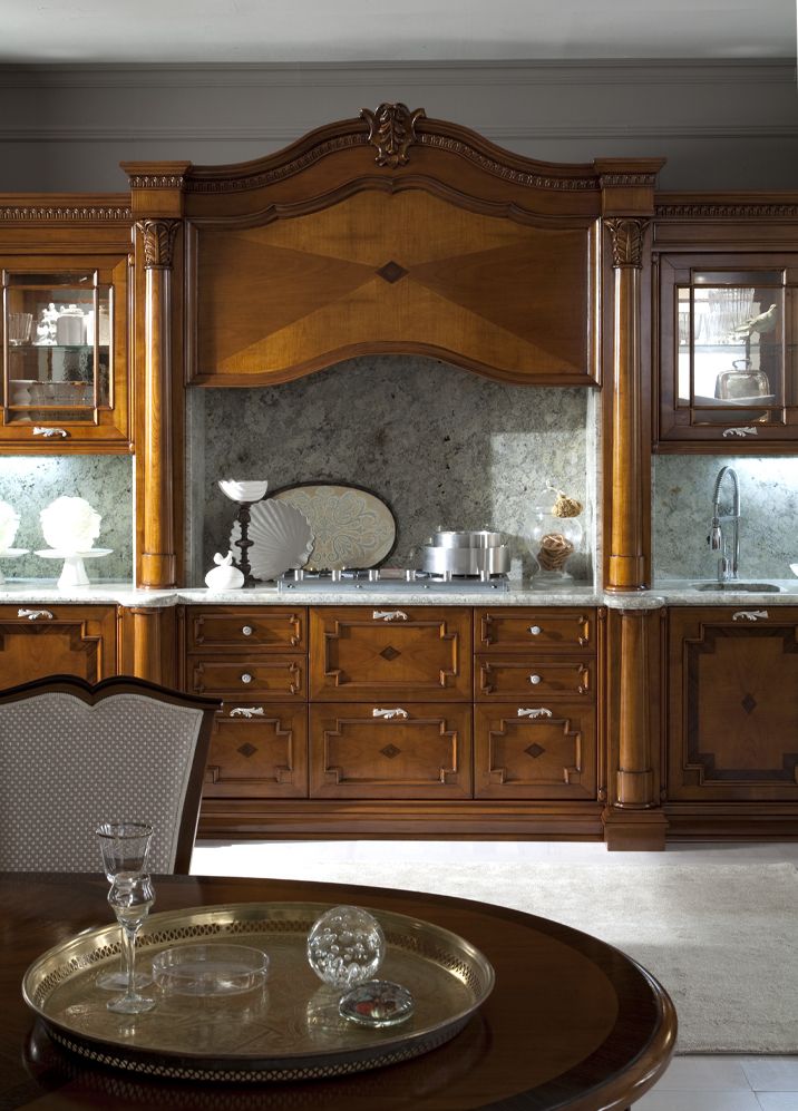With the Elizabeth collection, Bamax salvages decorative details from the past while integrating them in contemporary concepts for the kitchen. Pillars, half columns, capitals, pediments suggest structural elements, fold up drawers or extractor hoods for the cooking area.