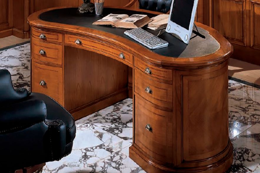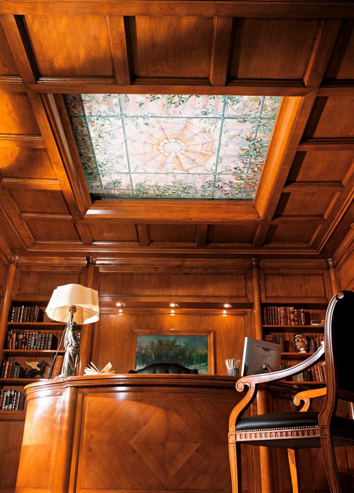 Wall panels and rounded pillars in cherry wood. Coffered ceiling with decorate glass insert. Inlayed writing desk with leather top.