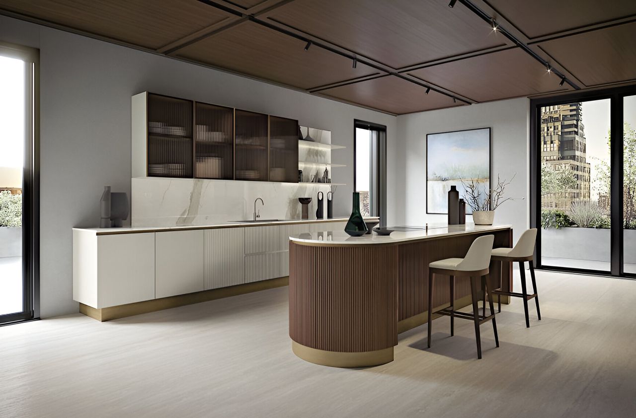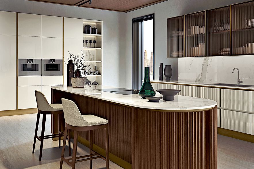 Vera espressione delle capacità progettuali e manifatturiere di Bamax, il nuovo modello Opale è pura esaltazione dell’arte applicata allo spazio cucina. La lavorazione cannettata delle ante è l’elemento caratterizzante di tutte le cucine Opale, che fondono ricercatezza stilistica, materiali pregiati e soluzioni altamente tecnologiche. L’essenza, in noce canaletto con finitura naturale o abbinata ai tocchi di colore delle superfici laccate, è la vera protagonista di questa cucina contemporanea dalle linee morbide e sinuose.